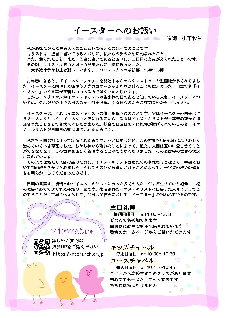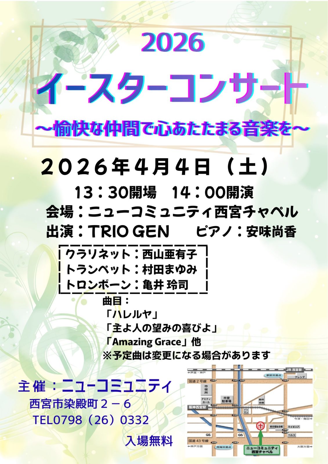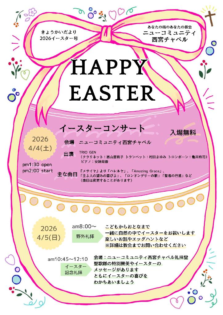 教会主催のイースターコンサートを、4月4日(土)の午後2時からニューコミュニティ西宮チャペルにて開催いたします。 演奏は、TRIO GEN(クラリネット:西山亜有子さん… -